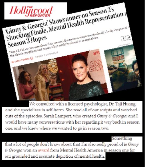 Dr. Taji Huang has already made a positive impact in the television industry with her work on the Netflix show Ginny & Georgia. The first season even won Mental Health America’s 2021 Media Award for its realistic, empathetic, and heartfelt portrayal of mental health issues in teenagers!